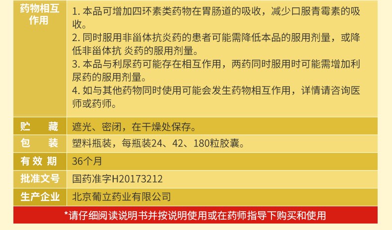 :1、本品宜在饭时或饭后服用,可减少胃肠道不适,特别是有胃溃疡的患者。 2、严重肝肾功能不全者慎用。 3、用药一疗程后,症状未缓解,请咨询医师或药师。 4、孕妇和哺乳期妇女慎用。 5、对本品过敏者禁用,过敏体质者慎用。 6、本品性状发生改变时禁止使用。 7、请将本品放在儿童不能接触的地方。 8、如正在使用其他药品,使用本品前请咨询医师或药师