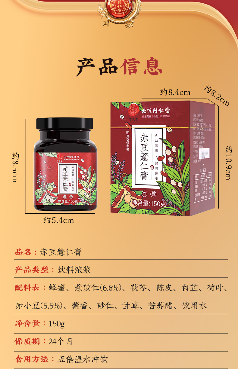 - 商品名称:同仁堂 赤豆薏仁膏 150g/瓶