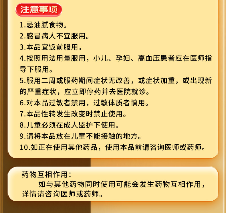 :1、忌油腻食物。 2、感冒病人不宜服用。 3、本品宜饭前服用。 4、按照用法用量服用,小儿、孕妇、高血压患者应在医师指导下服用。 5、服药二周或服药期间症状无改善,或症状加重,或出现新的严重症状,应立即停药并去医院就诊。 6、对本品过敏者禁用,过敏体质者慎用。 7、本品性状发生改变时禁止使用。 8、儿童必须在成人监护下使用。 9、请将本品放在儿童不能接触的地方。 10、如正在使用其他药品,使用本品前请咨询医师或药师。