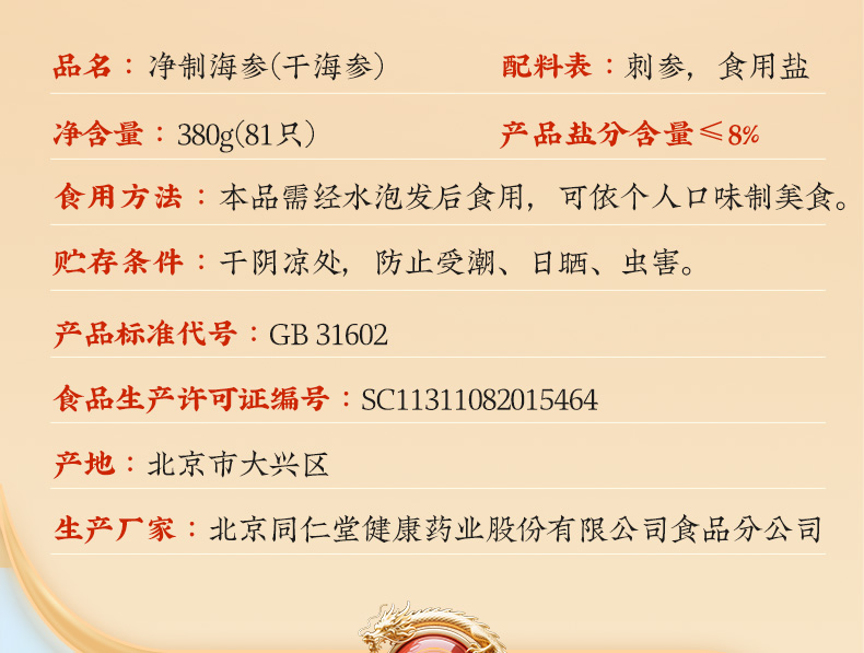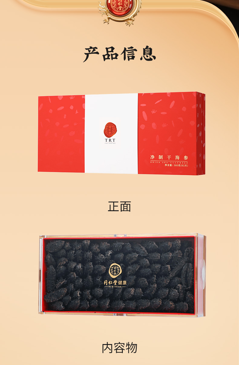 同仁堂 黑金辽参(速发海参)280克(60-90头/500克)/盒