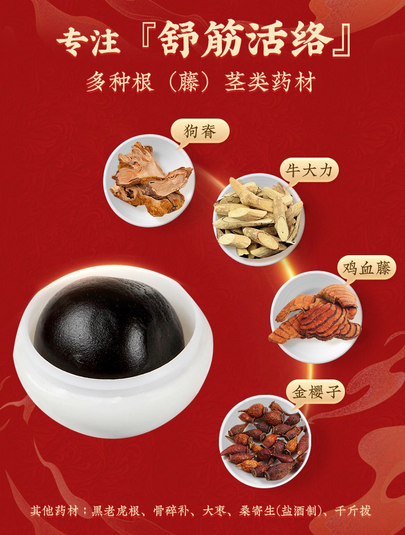 :狗脊、牛大力、黑老虎根、骨碎补、大枣、鸡血藤、桑寄生(盐酒制)、金樱子(盐制),千斤拔。辅料为蜂蜜。