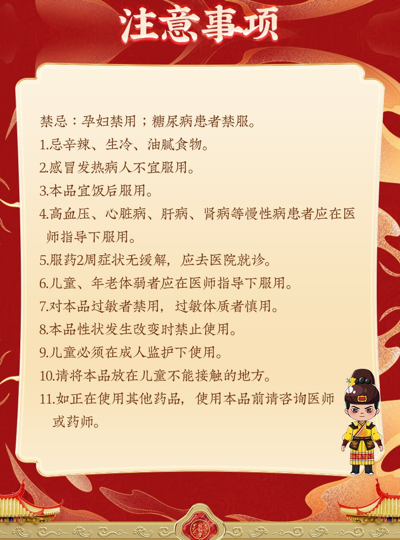 :1.忌辛辣、生冷,油腻食物。 2.感冒发热病人不宜服用。 3.本品宜饭后服用。 4.高血压、心脏病、肝病、肾病等慢性病患者应在医师指导下服用。 5.服药2周症状无缓解,应去医院就诊。 6,儿童。年老体弱者应在医师指导下服用。 7.对本品过敏者禁用,过敏体质者慎用。 8.本品性状发生改变时禁止使用。 9.儿童必须在成人监护下使用。 10.请将本品放在儿童不能接触的地方。 11.如正在使用其他药品,使用本品前请咨询医师或药师。
