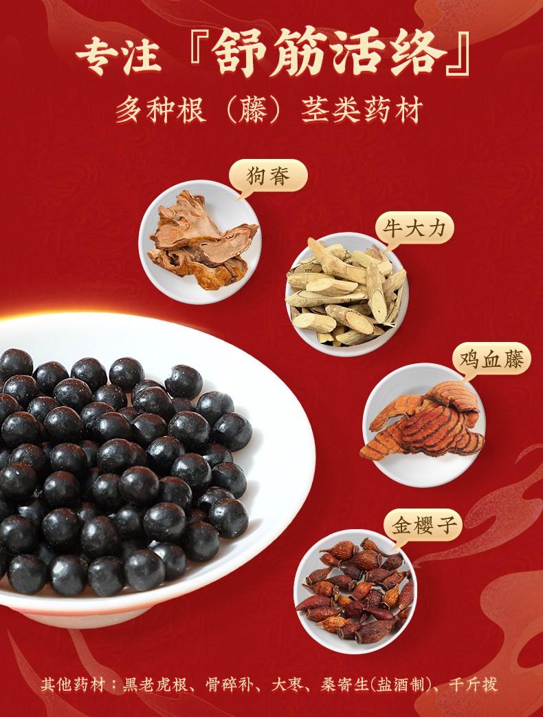 :狗脊、牛大力、黑老虎根、骨碎补、大枣、鸡血藤、桑寄生(盐酒制)、金樱子(盐制)、千斤拔。辅料为蔗糖、蜂蜜、包衣辅料为玉米朊。