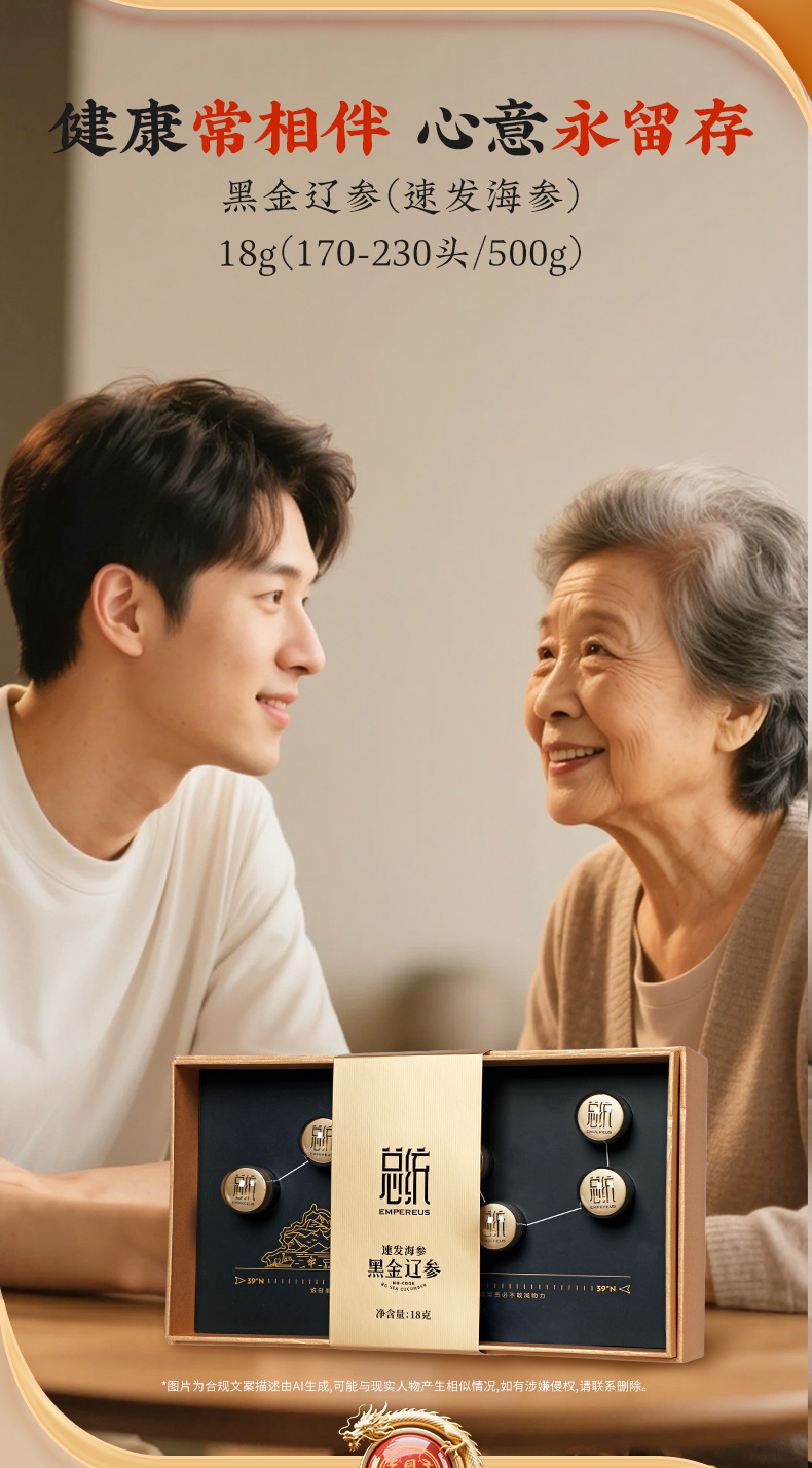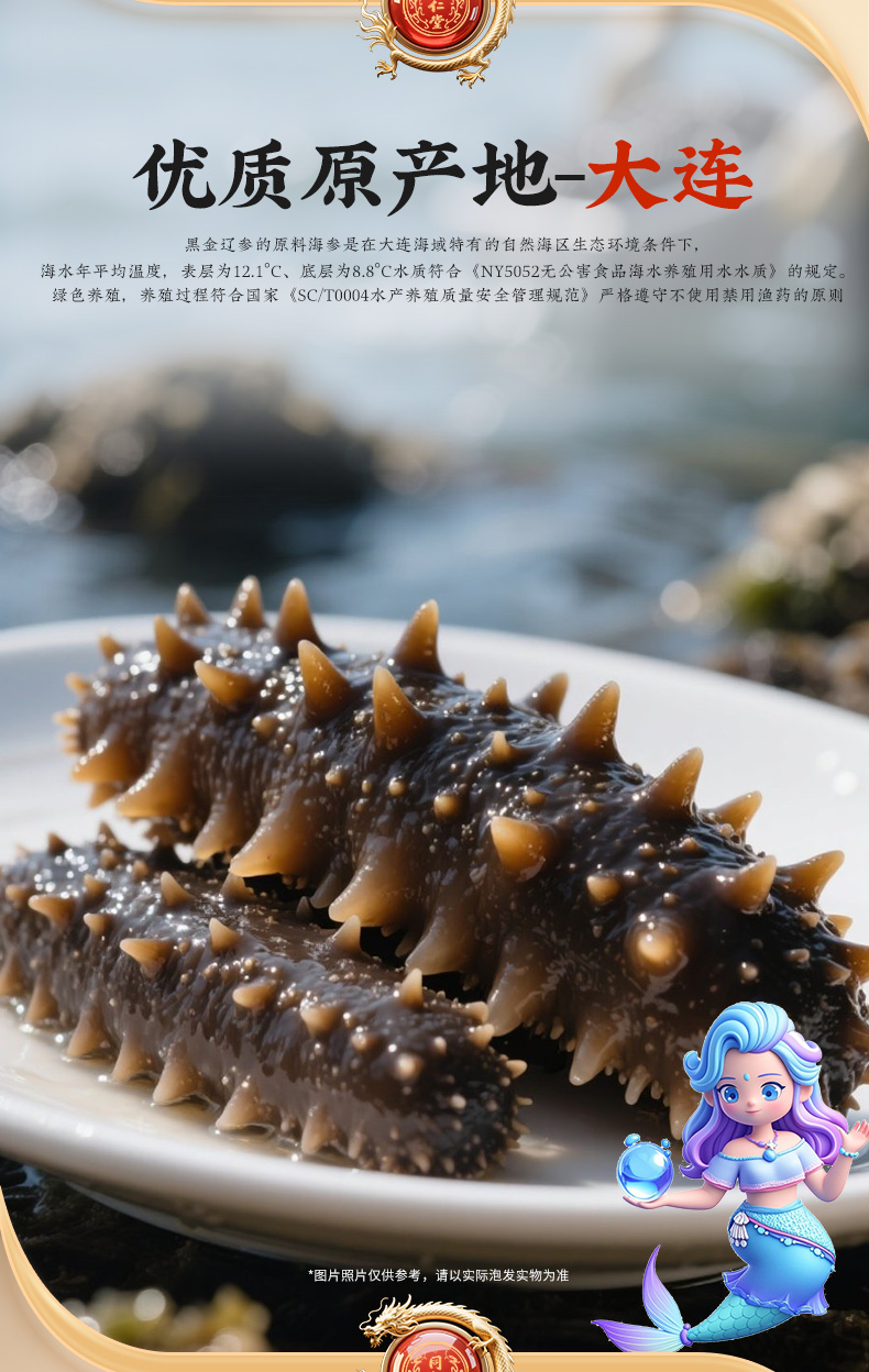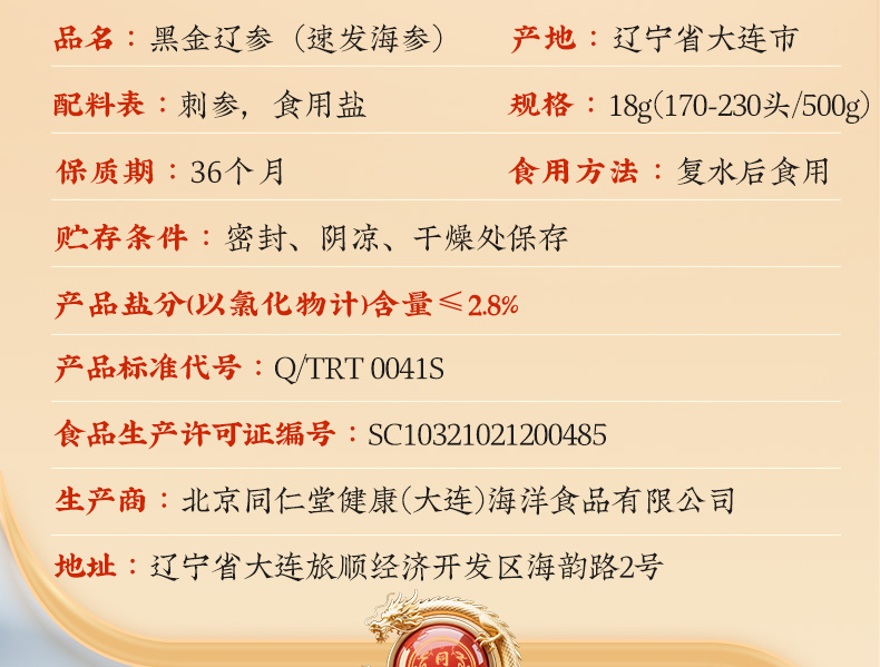 商品名称:同仁堂 黑金辽参(速发海参)18克(170-230头/500克)