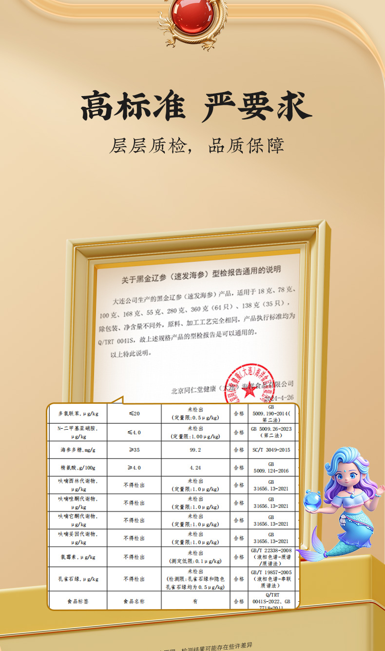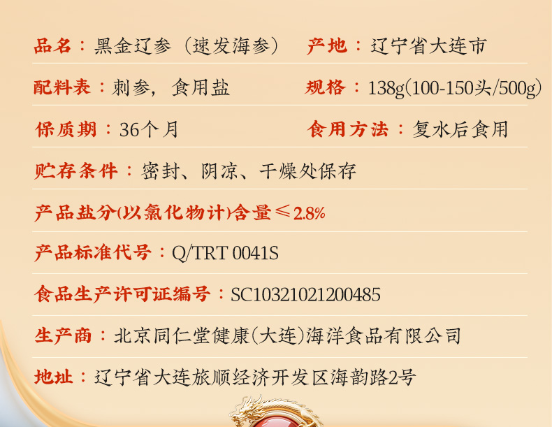 商品名称:同仁堂 黑金辽参(速发海参)138克(35只)/100-150头/500克