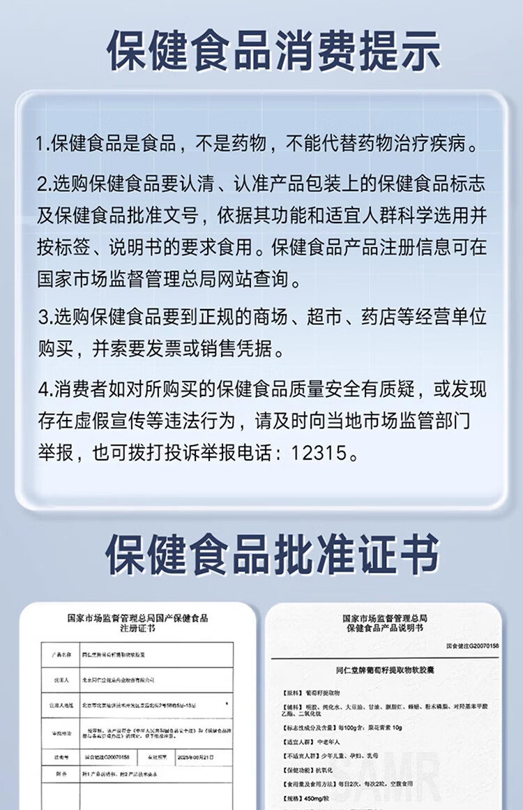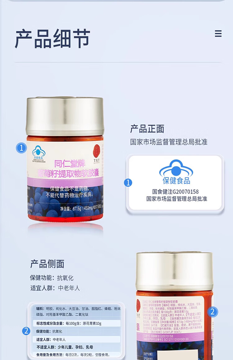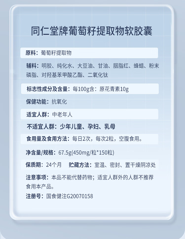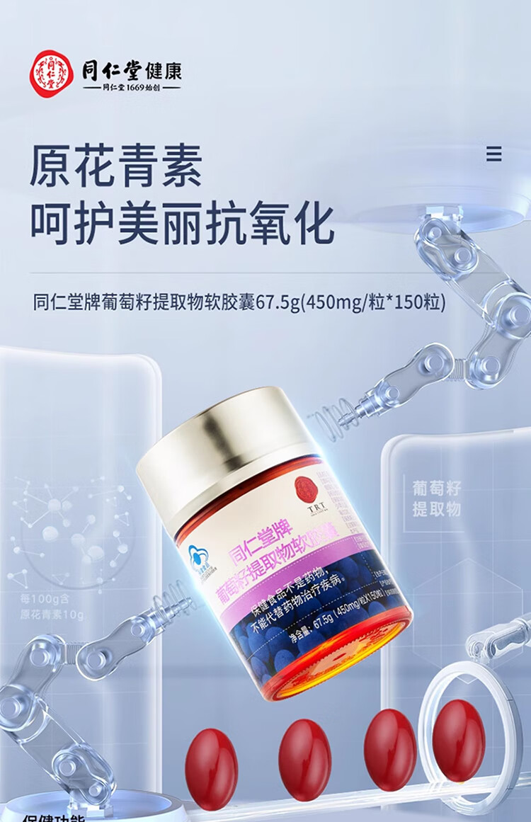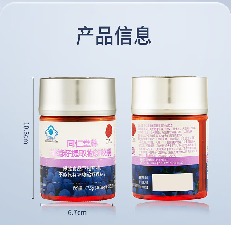 商品名称:同仁堂 葡萄籽提取物软胶囊 67.5g(150粒装)