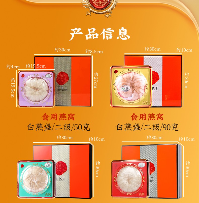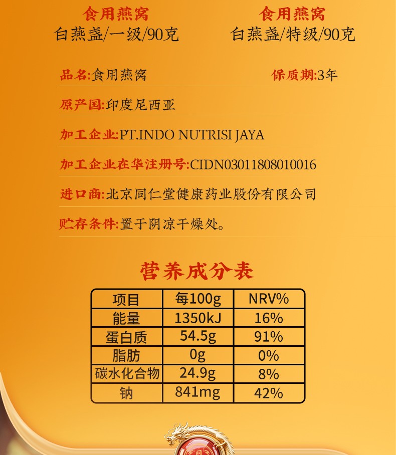 - 商品名称:同仁堂 食用燕窝 白燕盏/特级/90g/盒