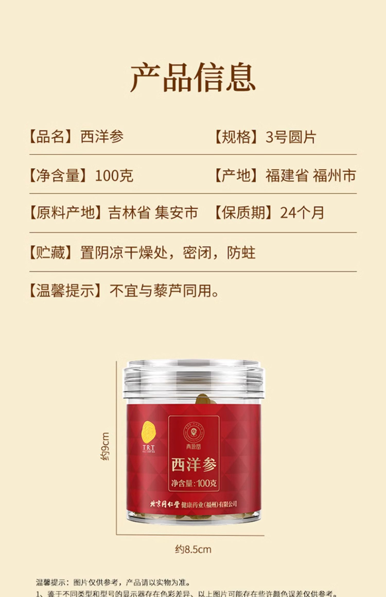 - 商品名称:同仁堂 西洋参 3号圆片 100g/盒