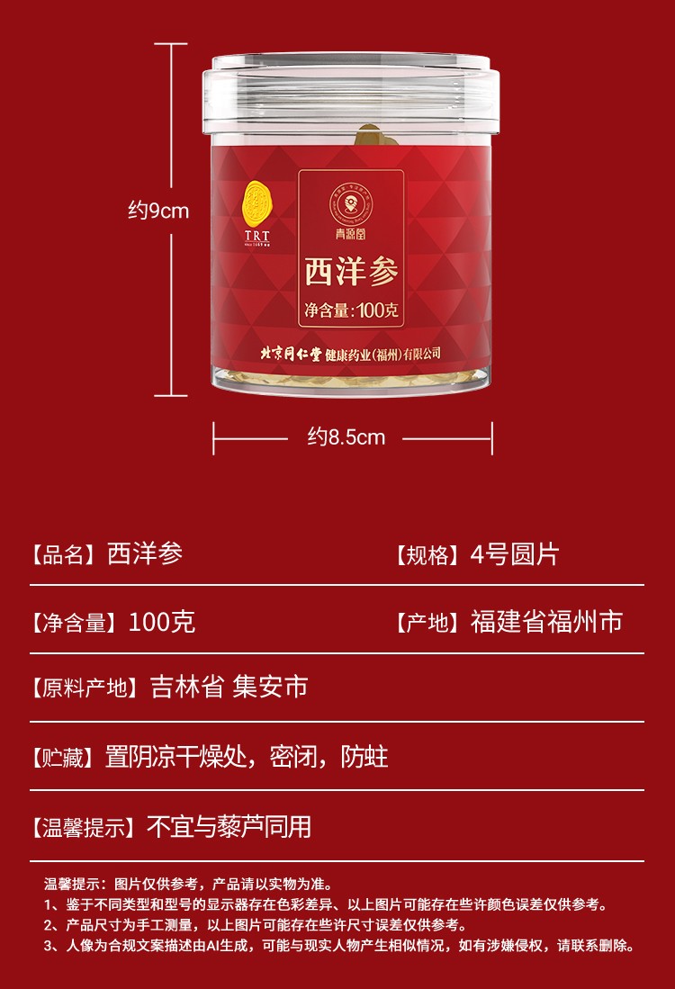 - 商品名称:同仁堂 西洋参 4号圆片 100克/瓶