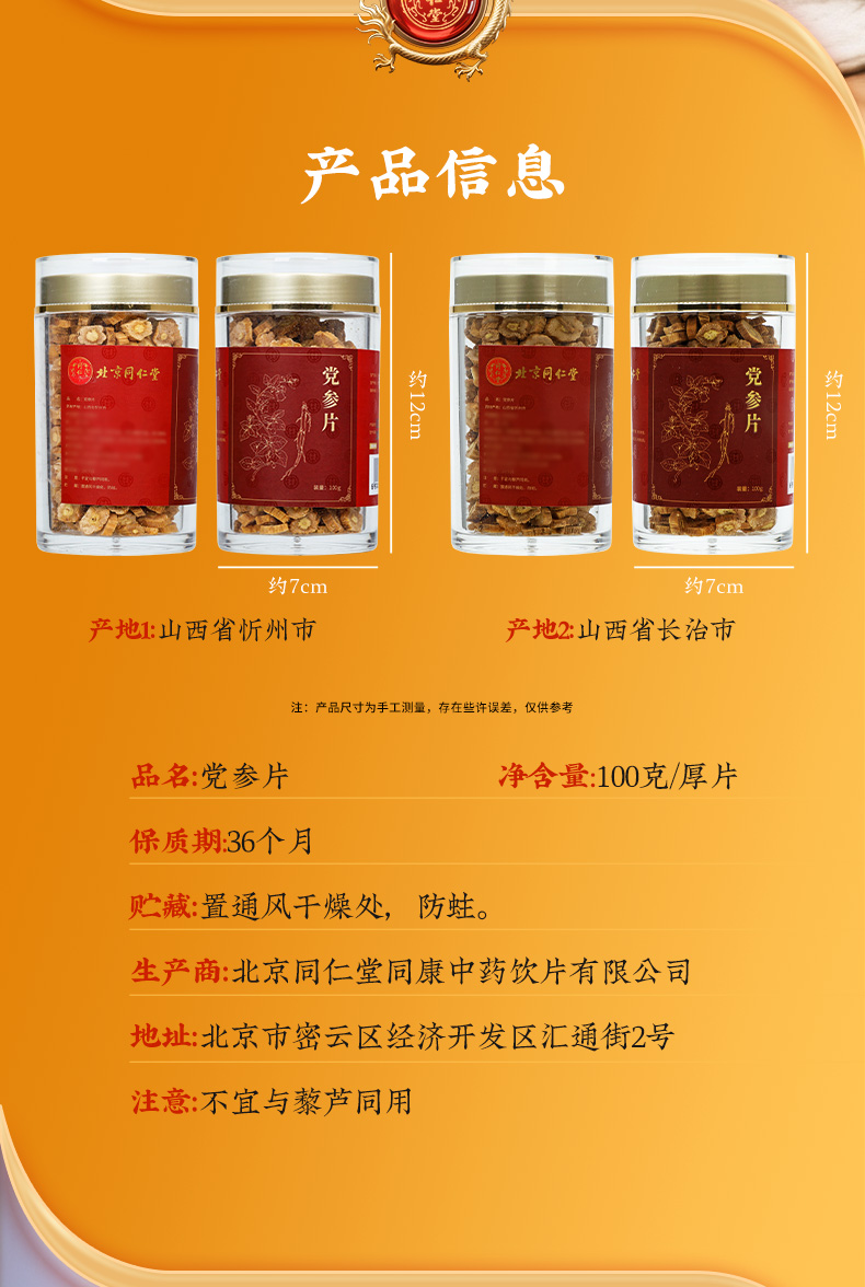 商品名称:同仁堂 党参片 厚片100g/瓶