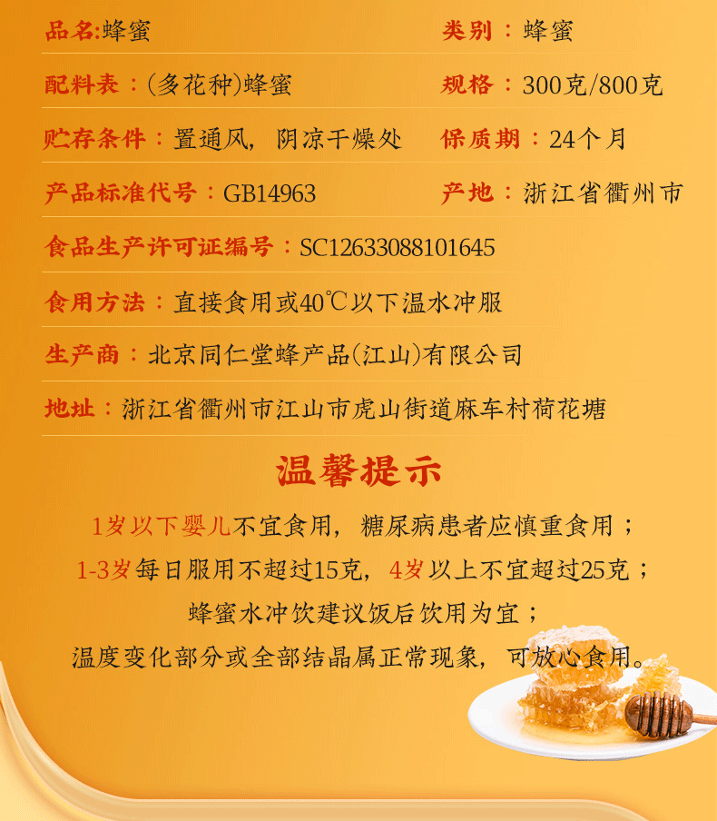 商品名称:同仁堂 蜂蜜 800g/瓶