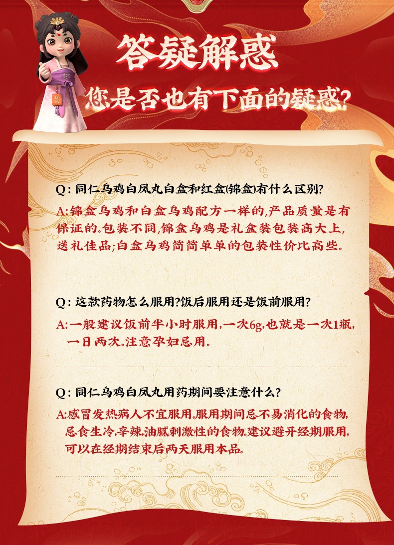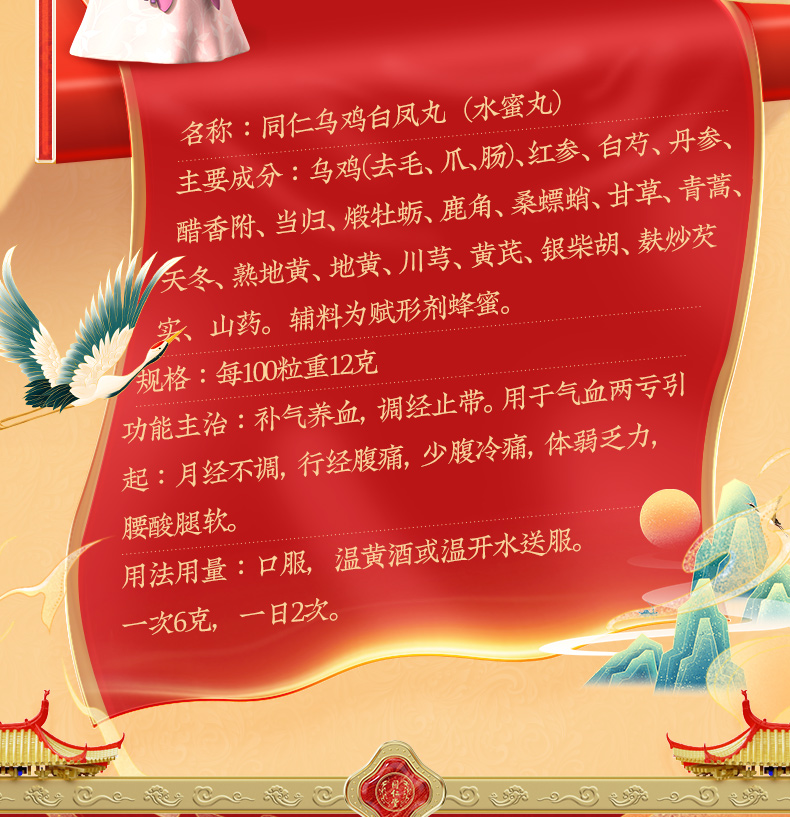 :乌鸡(去毛爪肠)、红参、白芍、丹参、香附(醋炙)、当归、牡蛎(煅)、鹿角、桑螵蛸、甘草、青蒿、天冬、熟地黄、地黄、川芎、黄芪、银柴胡、芡实(炒)、山药。辅料为赋形剂蜂蜜。