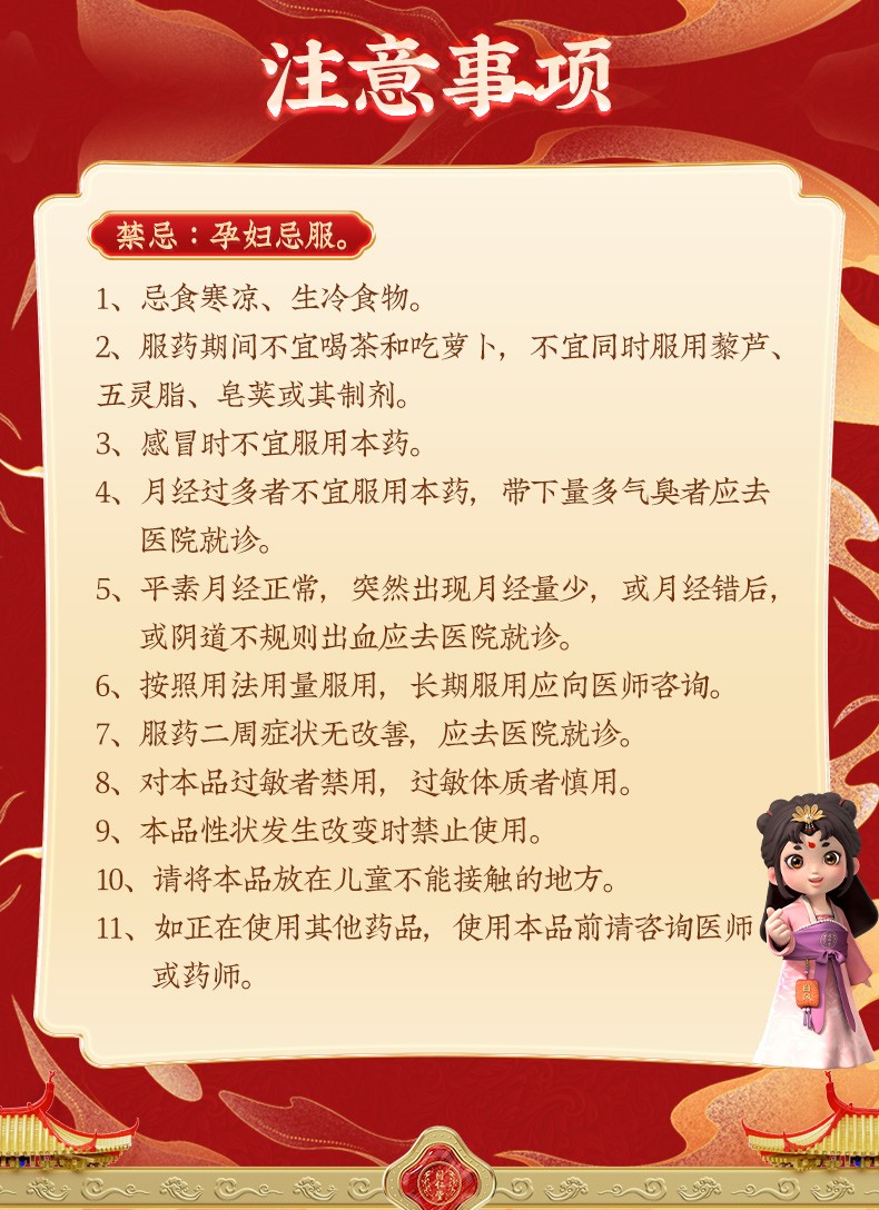 :1、忌辛辣、生冷食物。 2、感冒发热病人不宜服用。 3、有高血压、心脏病、肝病、糖尿病、肾病等慢性病严重者应在医师指导下服用。 4、青春期少女及更年期妇女应在医师指导下服用。 5、平素月经正常,突然出现月经过少,或经期错后,或阴道不规则出血者应去医院就诊。 6、伴有赤带者,应去医院就诊。 7、服药1个月症状无缓解,应去医院就诊。 8、对本品过敏者禁用,过敏体质者慎用。 9、本品性状发生改变时禁止使用。 10、请将本品放在儿童不能接触的地方。 11、如正在使用其他药品,使用本品前请咨询医师或药师。